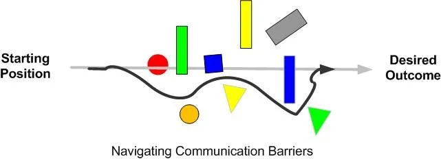 A useful way of visualising a complex object, while considering communication barriers is the graphic below. It resembles an obstacle course. In order to achieve a complex objective, we need to identify communication barriers with those we need to collaborate with, then we need to fathom out how to get through or navigate around communication barriers.